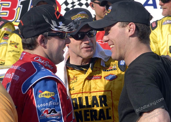 ![]() Stewart and Labonte reunited in victory lane, with their boss (right) | |